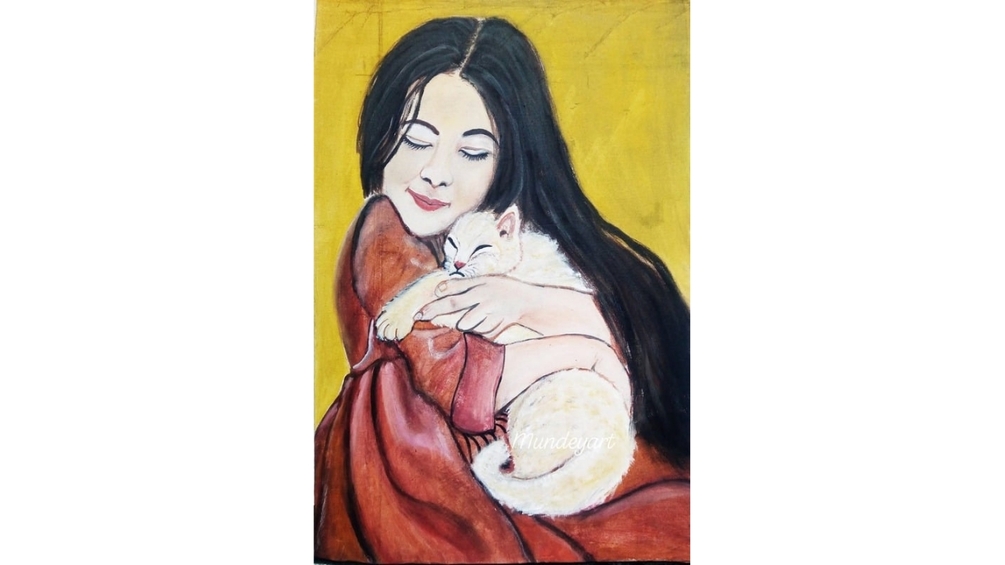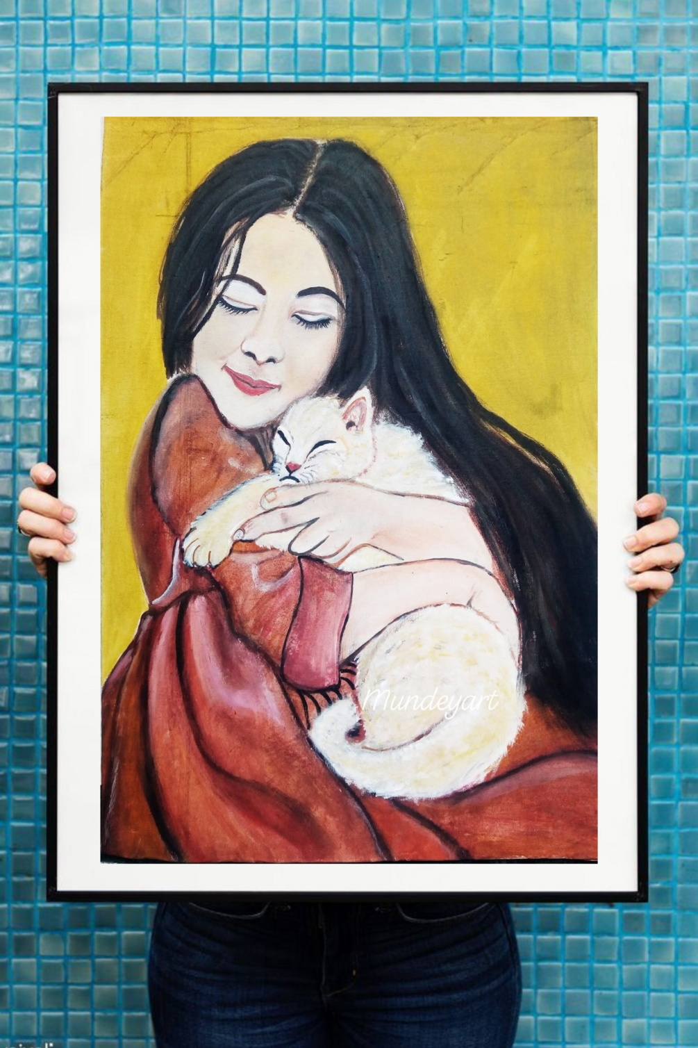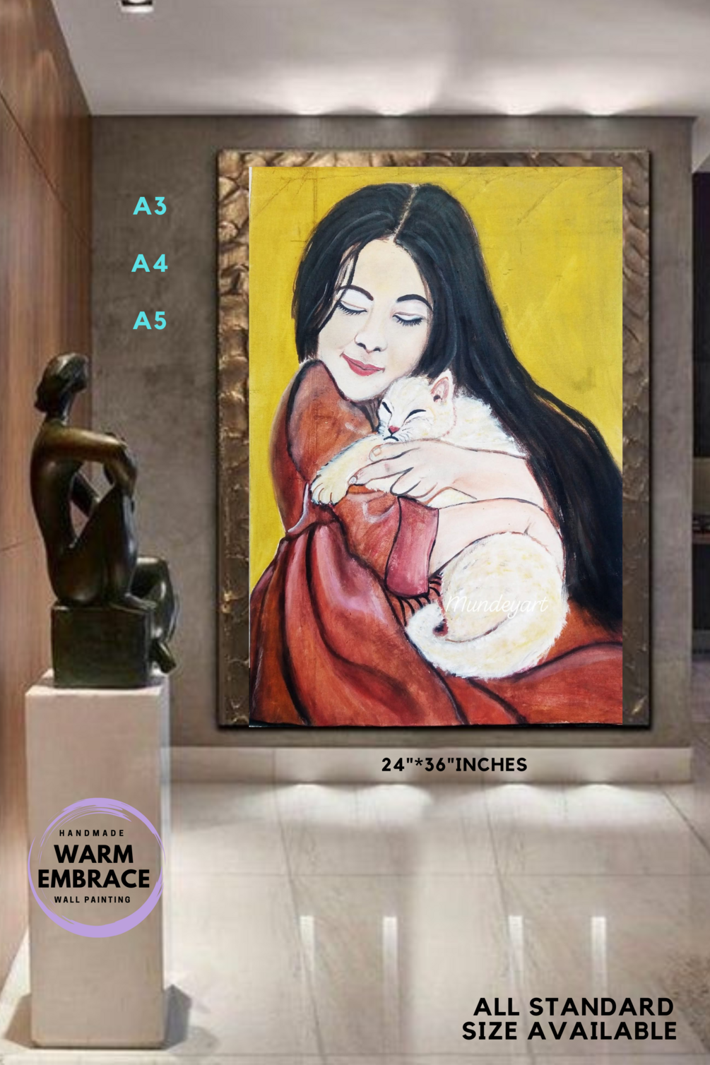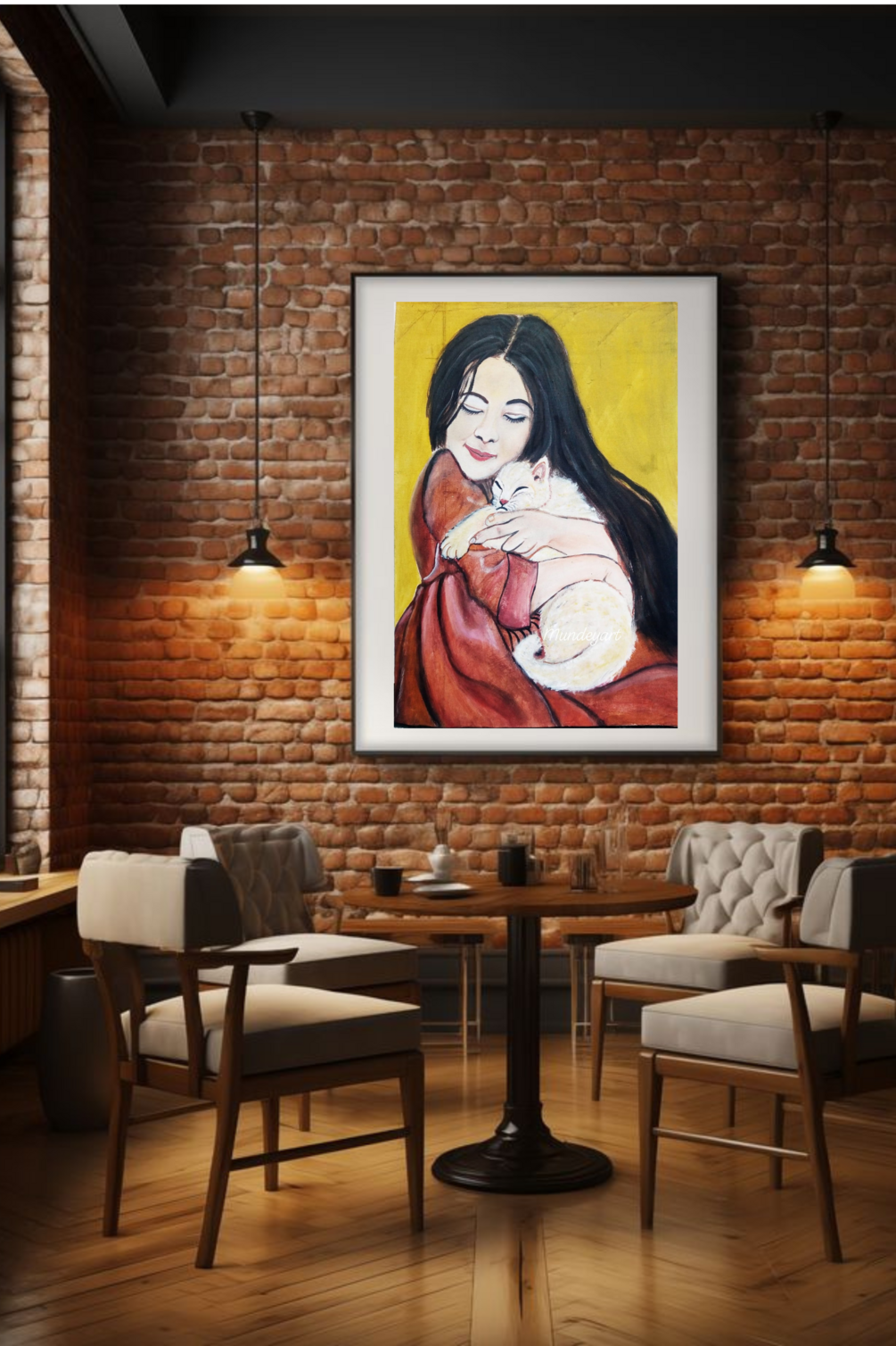 "Warm Embrace" is a hand-painted oil artwork capturing a tender moment of love β€” a girl hugging her beloved white cat. With soft brushstrokes and emotional warmth, this piece is perfect for cozy interiors, pet lovers, and those who cherish unspoken connections.