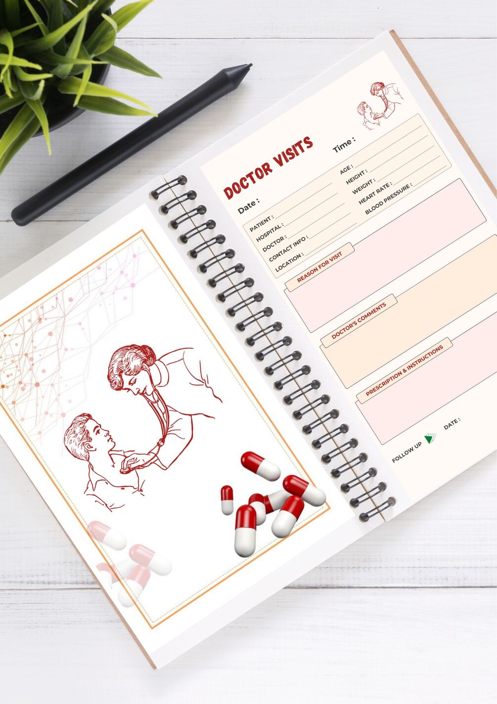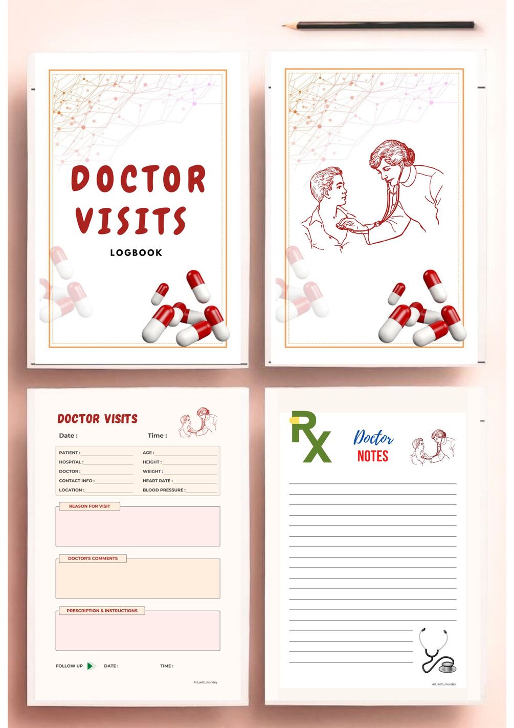 Doctor Visit Log, Templates, treatment planner,Rx pad,Printable Downloads pdf 6 "×9" inchs ,60 Pages journal ,Standard size A5 size
